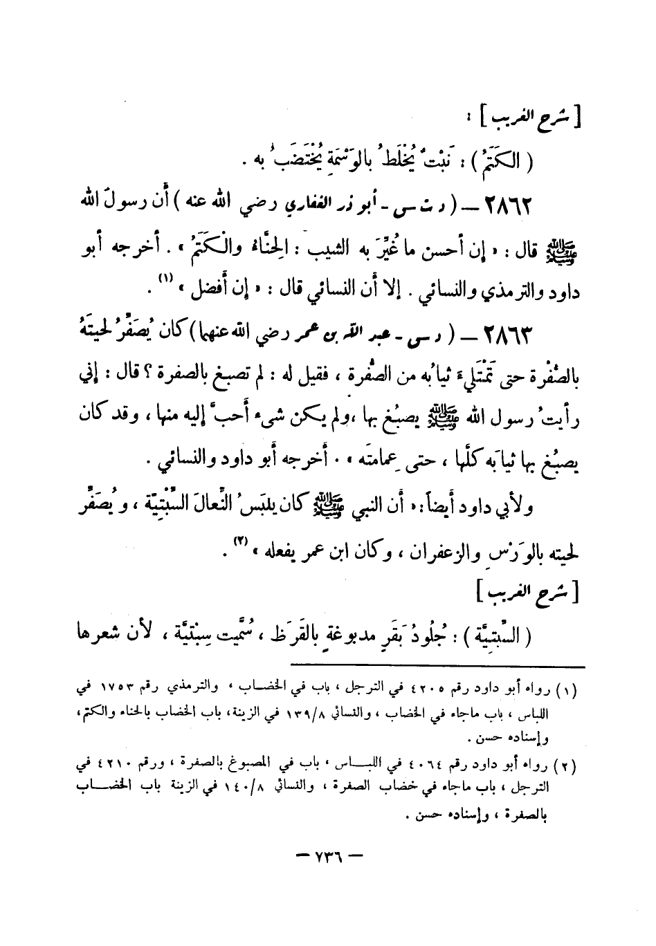 2863 - (د س) عبد الله بن عمر - رضي الله عنهما -: كان يُصَفِّرُ لحيتَهُ بالصُّفْرة حتى تَمْتَلىءَ ثيابُه من الصُّفرة، فقيل له: لم تصبغ بالصفرة؟ قال: «إِني رأيتُ رسول الله- صلى الله عليه وسلم- يصبُغ بها، ولم يكن شيء أَحبَّ إِليه منها، وقد كان يصبُغ بها ثيابَه كلَّها، حتى عِمَامَته» . أَخرجه أبو داود، والنسائي.