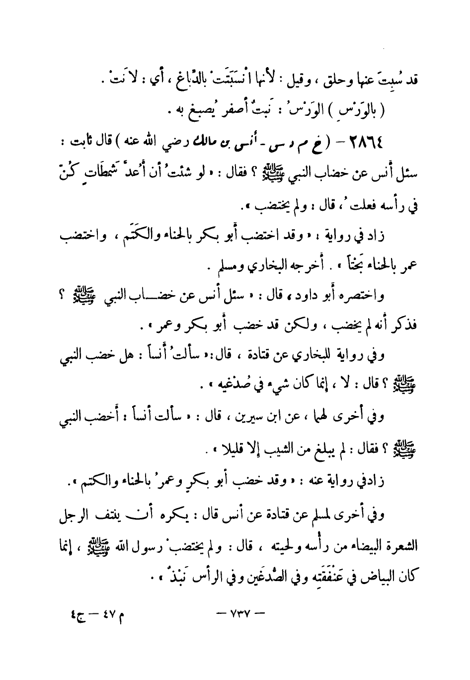 2864 - (خ م د س) أنس بن مالك - رضي الله عنه -: قال ثابت: سئل أَنس عن خضاب النبي - صلى الله عليه وسلم-؟ فقال: «لو شئتُ أن أَعُدَّ شَمطَاتٍ كُنّ في رأسه فعلتُ، قال: ولم يختضب» .