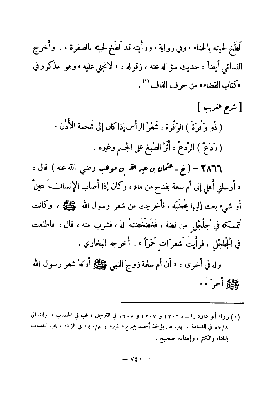 وله في أخرى: «أن أم سلمة زوجَ النبي - صلى الله عليه وسلم- أَرَتهُ شعر رسول الله -صلى الله عليه وسلم- أحمر» . -[741]-