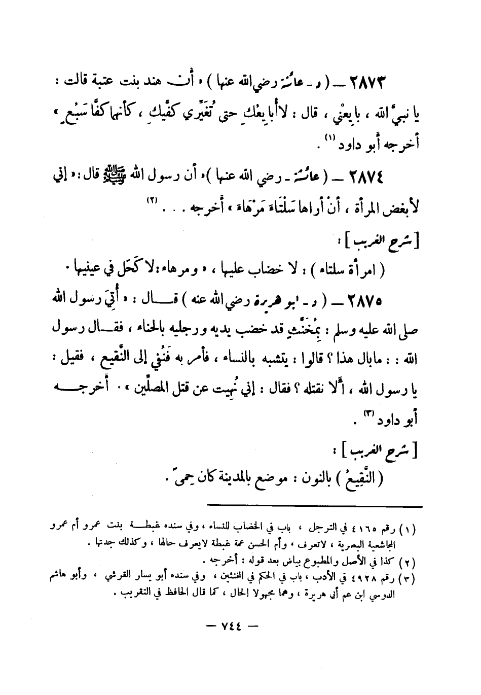 2873 - (د) عائشة - رضي الله عنها -: «أن هند بنت عتبة قالت: يا نبيَّ الله، بايِعْني، قال: لا أُبايِعُكِ حتى تُغَيِّري كفَّيكِ، كأنهما كفَّا سَبُعٍ» . أخرجه أَبو داود (¬1) .