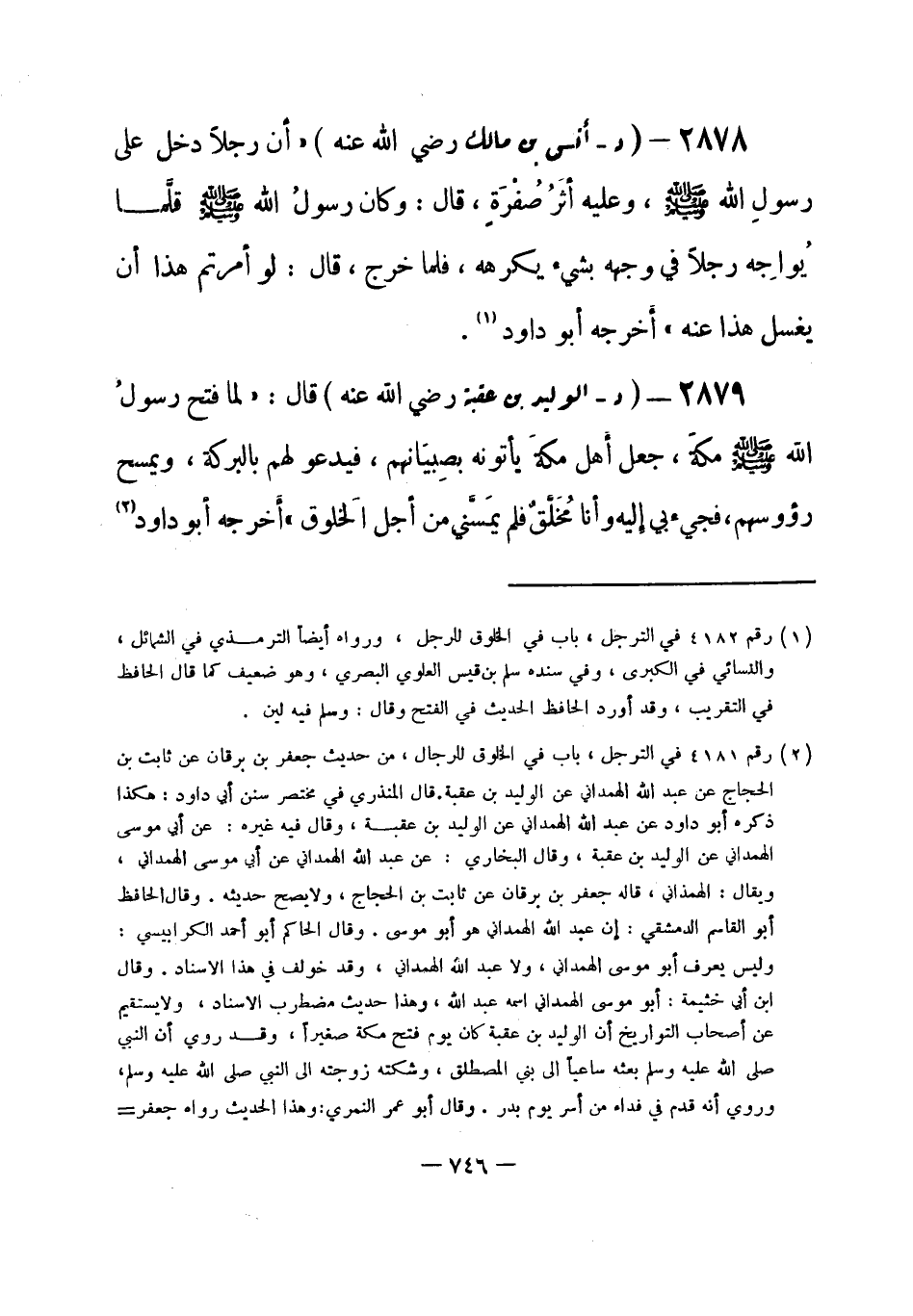 2879 - (د) الوليد بن عقبة - رضي الله عنه -: قال: «لما فتح رسولُ الله - صلى الله عليه وسلم- مكةَ، جعل أَهل مكةَ يأتونه بِصِبيَانهم، فيدعو لهم بالبركة، ويمسح رؤوسهم، فجيء بي إليه، وأنا مُخَلَّقٌ فلم يمسَنَّي من أجل الخََلوق» . أَخرجه أبو داود (¬1) .