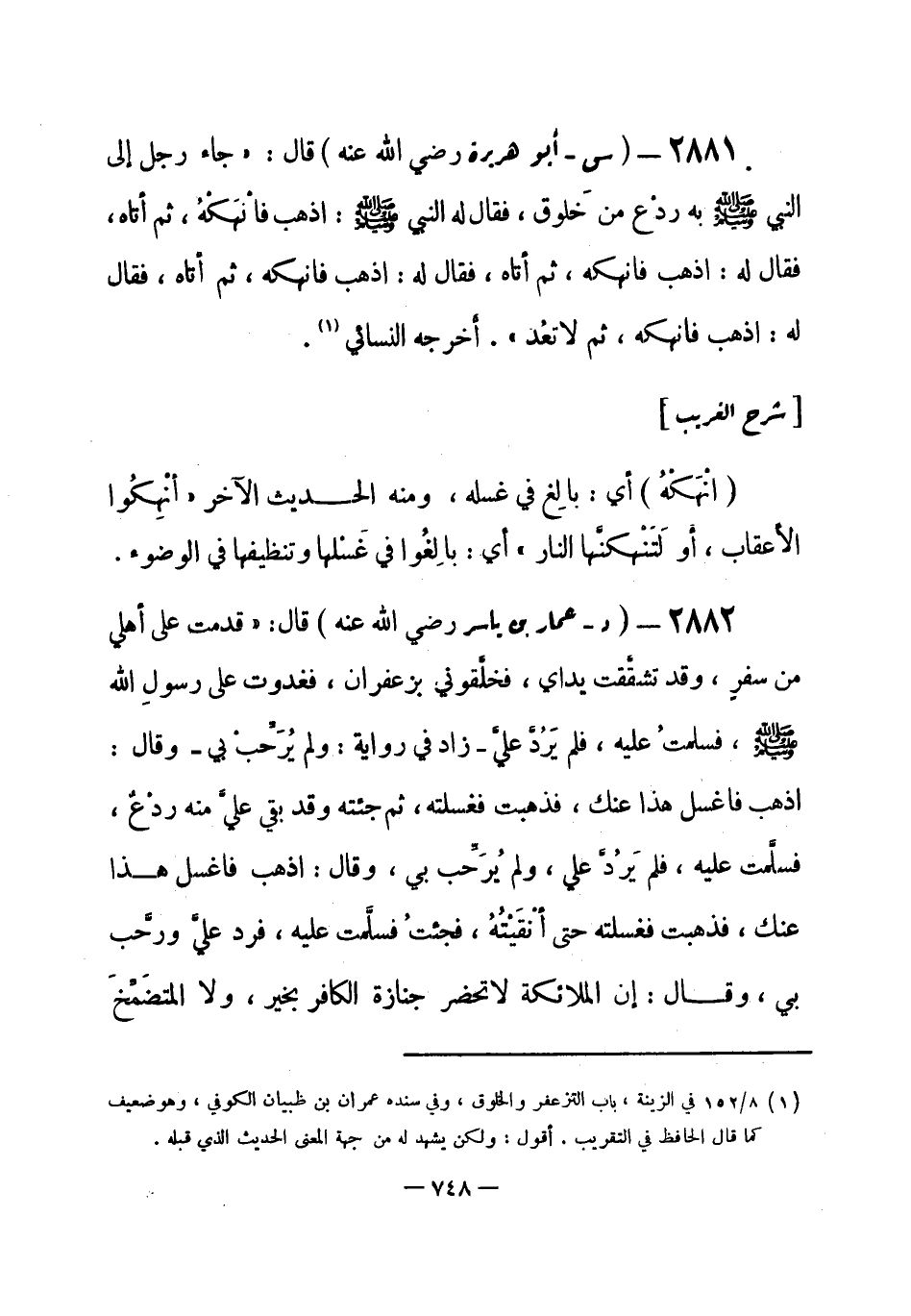 * أخرجه الحميدي (1169) قال: حدثنا سفيان. قال: حدثنا عمران بن ظبيان الحنفي، أنه سمع رجلا من بني حنيفة. يقول: سمعت أبا هريرة. يقول: «ذهبت مع رسول الله -صلى الله عليه وسلم- إلى يهود بني قينقاع يدارسهم. فأبصر رسول الله -صلى الله عليه وسلم- رجلا متخلقا. فقلت: يا رسول الله لعله عروس. فقال رسول الله -صلى الله عليه وسلم-: «وإن، اذهب فاغسله، ثم انهكه، ثم اغسله، ثم انهكه، ثم اغسله، ثم انهكه» .