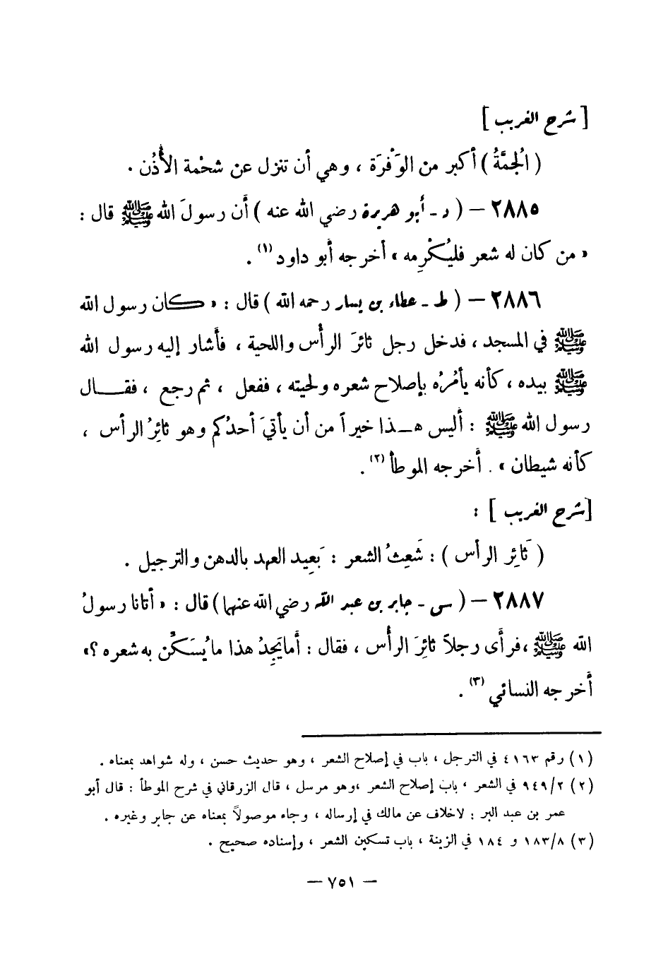 2885 - (د) أبو هريرة - رضي الله عنه -: أَنَّ رسولَ اللهِ - صلى الله عليه وسلم- قال: «من كان له شعر فليُكْرِمه» . أخرجه أبو داود (¬1) .