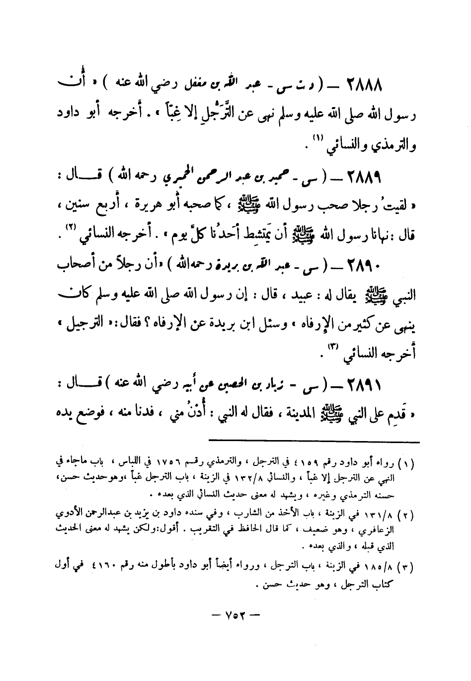 2888 - (د ت س) عبد الله بن مغفل - رضي الله عنه -: «أَنَّ رسولَ الله - صلى الله عليه وسلم- نهى عن التَّرَجُّلِ إِلا غِبّاً» . أخرجه أبو داود، والترمذي، والنسائي (¬1) .