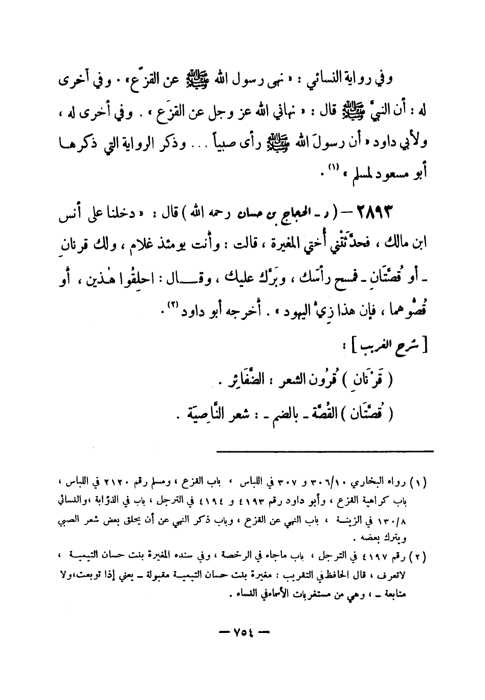 2893 - (د) الحجاج بن حسان - رحمه الله -: قال: «دخلنا على أنس بن مالك، فحدَّثْتني أُختي المغيرة، قالت: وَأنت يومئذ غلام، ولك قرنانِ - أو قُصَّتَانِ - فمسح رأسَك، وبَرَّكَ عليك، وقال: احلِقُوا هذين، أَو قُصُّوهما، فإن هذا زِيُّ اليهود» . أَخرجه أبو داود (¬1) .