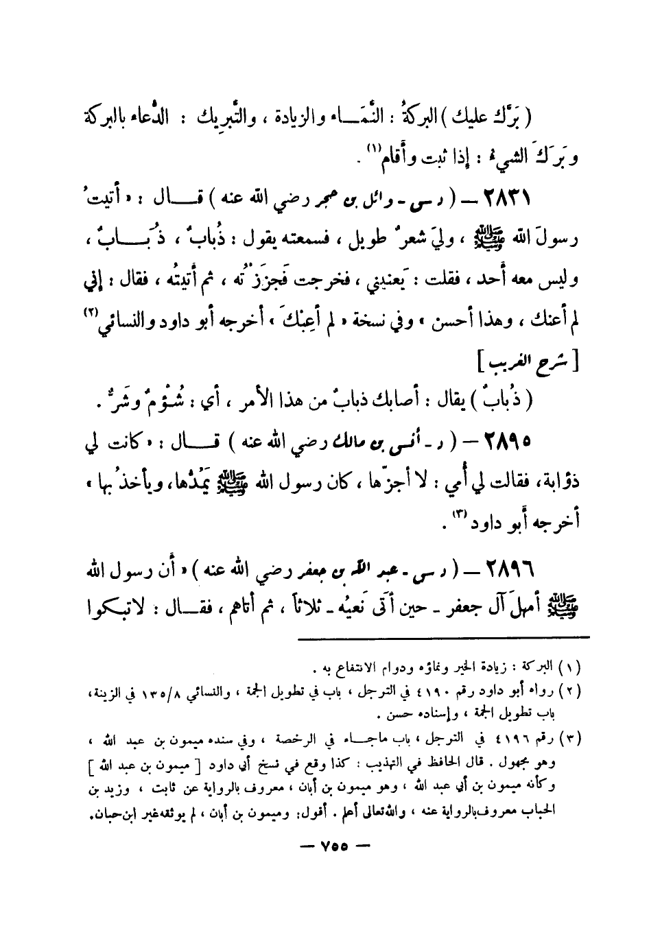 2894 - (د س) وائل بن حجر - رضي الله عنه -: قال: «أَتيتُ رسولَ الله - صلى الله عليه وسلم-، وليَ شعرٌ طويل، فسمعته يقول: ذُبابٌ، ذُبَابٌ، وليس معه أَحد، فقلت: يَعنيني، فخرجت فَجَزَزْتُه، ثم أَتيتُه، فقال: إِني لم أعنك، وهذا أحسن» . وفي نسخة: «لم أعِبْكَ» . أخرجه أبو داود، والنسائي (¬1) .