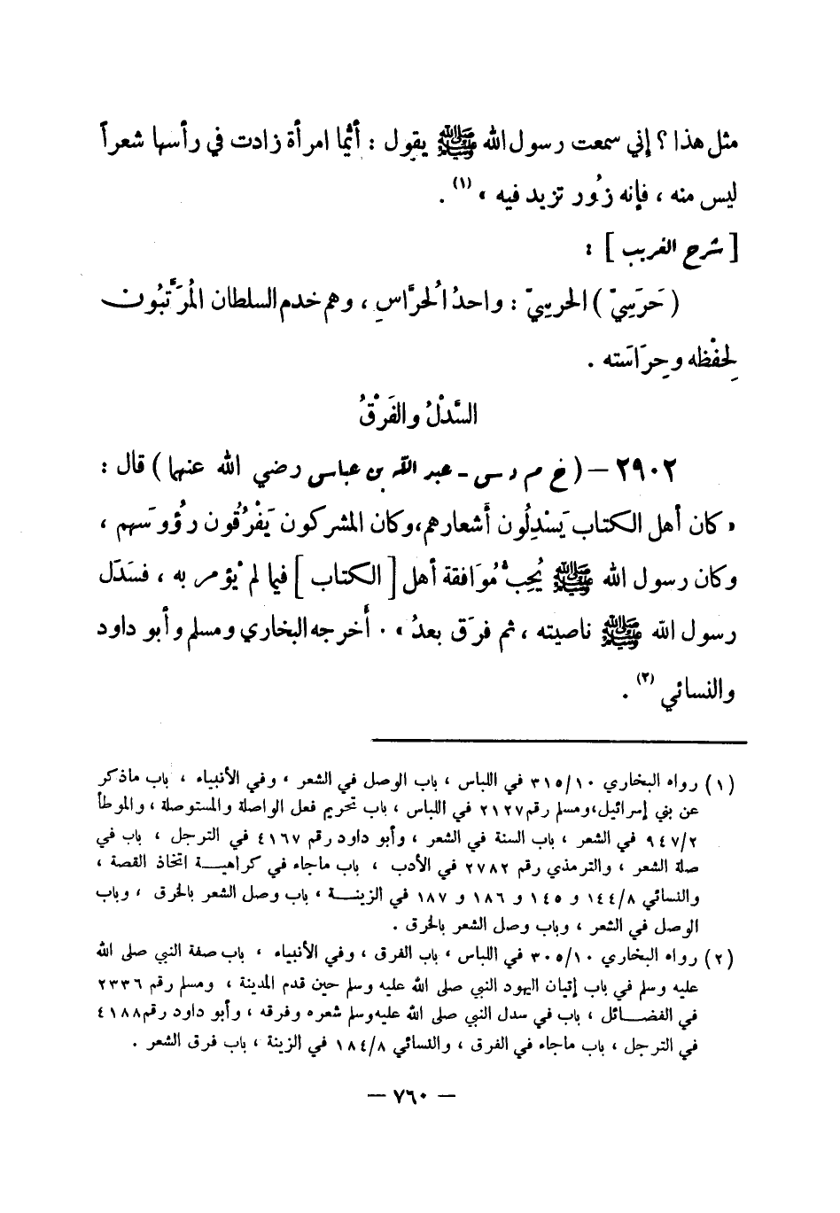 2902 - (خ م د س) عبد الله بن عباس - رضي الله عنهما -: قال: «كان أهل الكتاب يَسْدِلُون أَشعارهم، وكان المشركون يَفْرُقُون رؤُوسَهم، وكان رسول الله - صلى الله عليه وسلم- يُحِبُّ مُوَافقة أهل [الكتاب] فيما لم يُؤْمر به، فسَدَل رسول الله - صلى الله عليه وسلم- ناصيته، ثم فرَق بعدُ» . أَخرجه البخاري، ومسلم، وأبو داود، والنسائي (¬1) . -[761]-