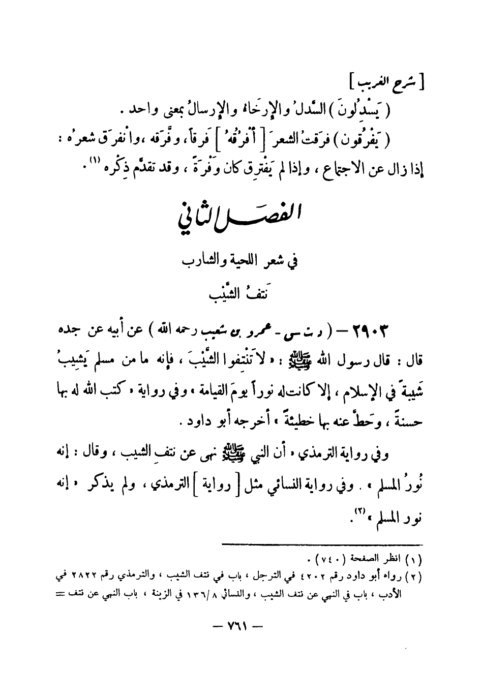 (¬1) رواه أبو داود رقم (4202) في الترجل، باب في نتف الشيب، والترمذي رقم (2822) في الأدب، باب في النهي عن نتف الشيب، والنسائي 8 / 136 في الزينة، باب النهي عن نتف -[762]- الشيب، وإسناده حسن، وقال الترمذي: هذا حديث حسن، وقد رواه عبد الرحمن بن الحارث وغير واحد عن عمرو بن شعيب عن أبيه عن جده. أقول: ورواه أيضاً ابن ماجة رقم (3721) في الأدب، باب نتف الشيب، وقد رواه مسلم رقم (2341) في الفضائل، باب شيبه صلى الله عليه وسلم من حديث قتادة عن أنس بن مالك رضي الله عنه قال: يكره أن ينتف الرجل الشعرة البيضاء من لحيته ورأسه.