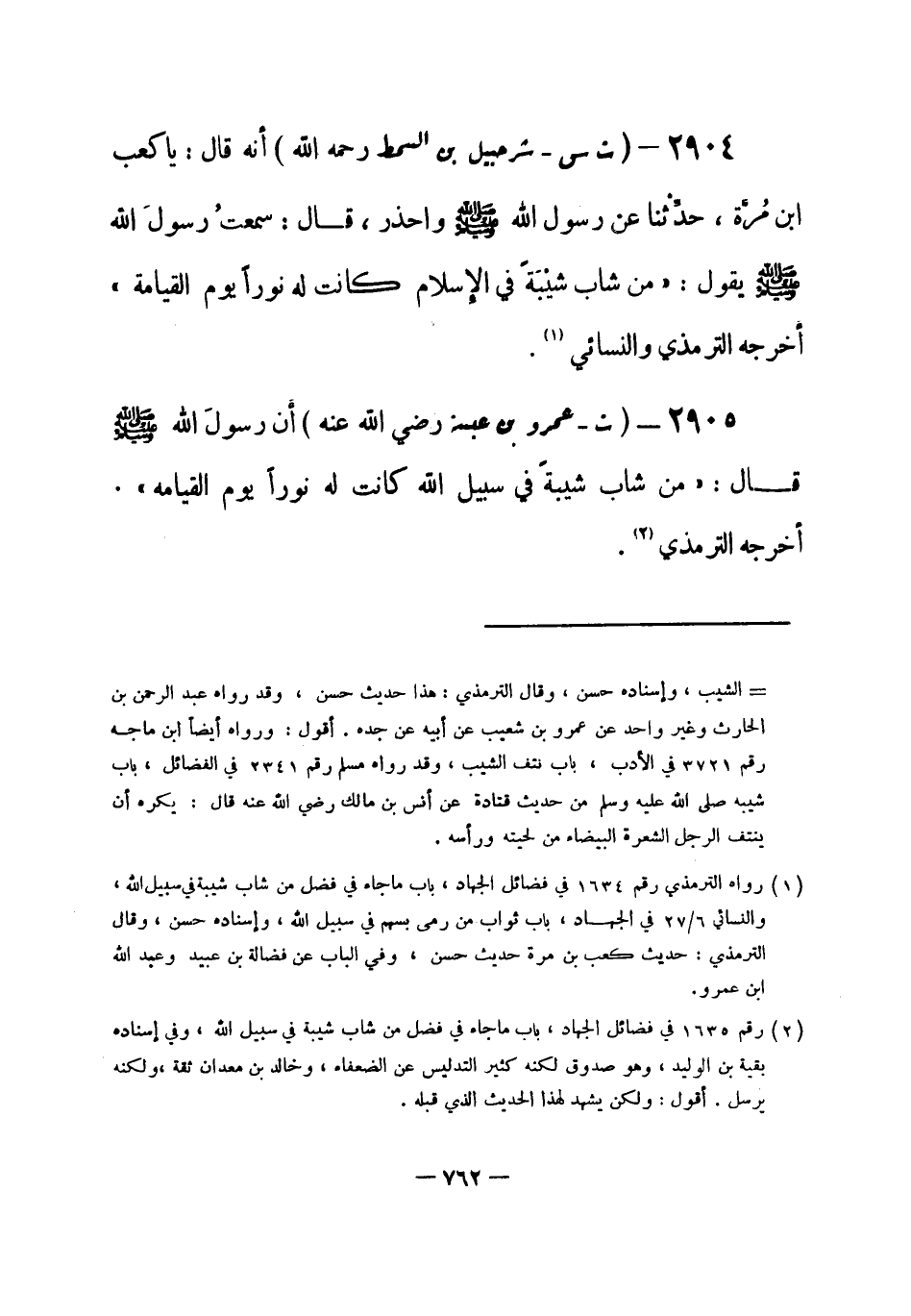 2905 - (ت) عمرو بن عبسة - رضي الله عنه -: أَنَّ رسولَ اللهِ - صلى الله عليه وسلم- قال: «من شاب شيبة في سبيل الله كانت له نوراً يوم القيامة» . أَخرجه الترمذي (¬1) .