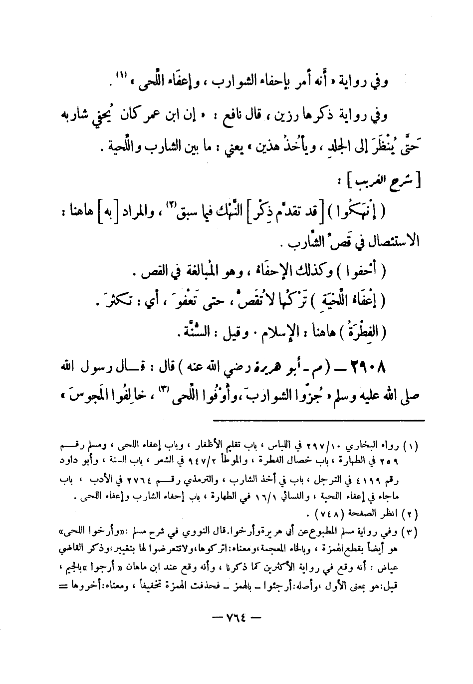 2908 - (م) أبو هريرة - رضي الله عنه -: قال: قال رسول الله - صلى الله عليه وسلم-: «جُزّوا الشواربَ، وأَوْفُوا اللِّحى (¬1) ، خالِفُوا المَجوسَ» . -[765]- أَخرجه مسلم (¬2) .