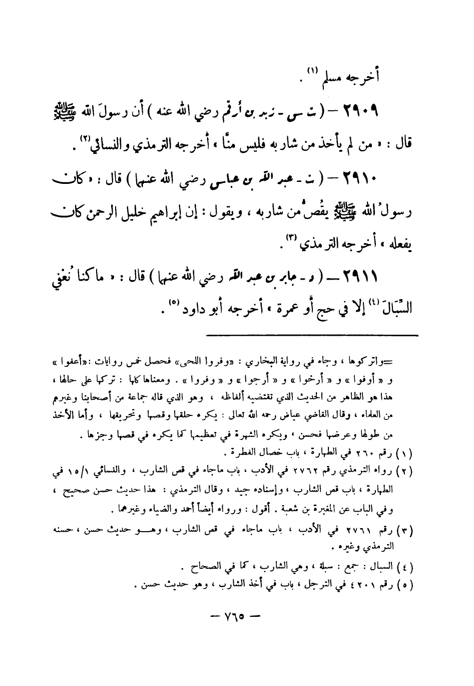 2909 - (ت س) زيد بن أرقم - رضي الله عنه -: أَنَّ رسولَ اللهِ - صلى الله عليه وسلم- قال: «مَن لم يأخذ من شاربه فليس منَّا» . أَخرجه الترمذي، والنسائي (¬1) .