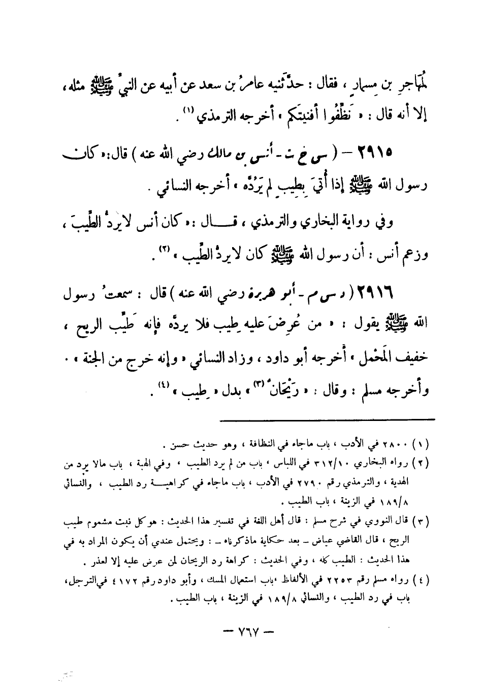 2915 - (س خ ت) أنس بن مالك - رضي الله عنه -: قال: «كان رسولُ الله - صلى الله عليه وسلم- إِذا أُتيَ بِطِيبٍ لم يَرُدَّهُ» . أخرجه النسائي.