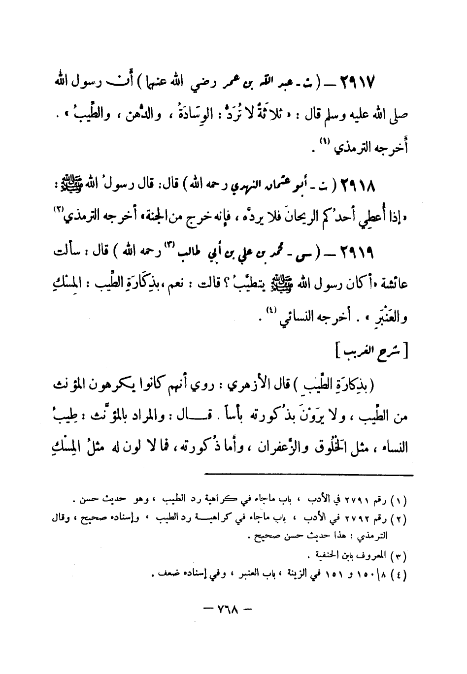 2917 - (ت) عبد الله بن عمر - رضي الله عنهما -: أَنَّ رسولَ اللهِ - صلى الله عليه وسلم- قال: «ثلاثَةٌ لا تُرَدُّ: الوِسَادَةُ، والدُّهْنُ، والطِّيبُ» . أَخرجه الترمذي (¬1) .