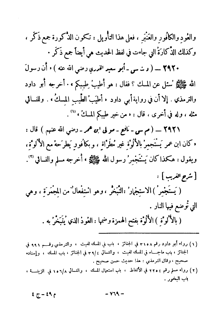 2920 - (د ت س) أبو سعيد الخدري - رضي الله عنه -: «أَنَّ رسولَ الله - صلى الله عليه وسلم- سُئل عن المسك؟ فقال: هو أَطيبُ طِيبكم» . أخرجه أَبو داود، والترمذي. إِلا أن في رواية أبي داود: «أطيَبُ الطِّيبِ المِسكُ» . وللنسائي مثله، وله في أخرى، قال: «من خير طيبكم المسكُ» (¬1) .