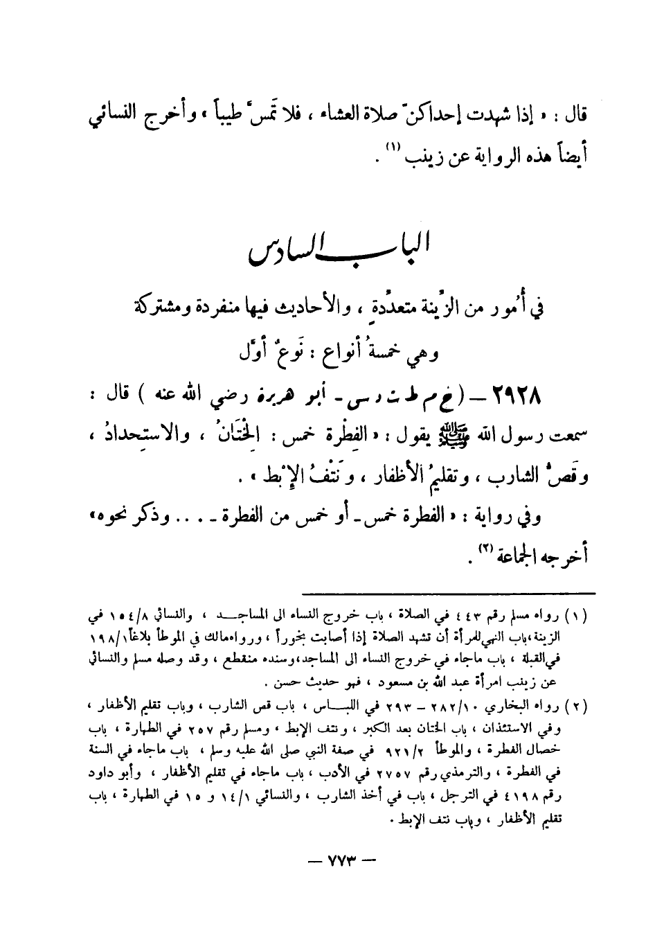 الباب السادس: في أمور من الزينة متعددة، والأحاديث فيها منفردة ومشتركة