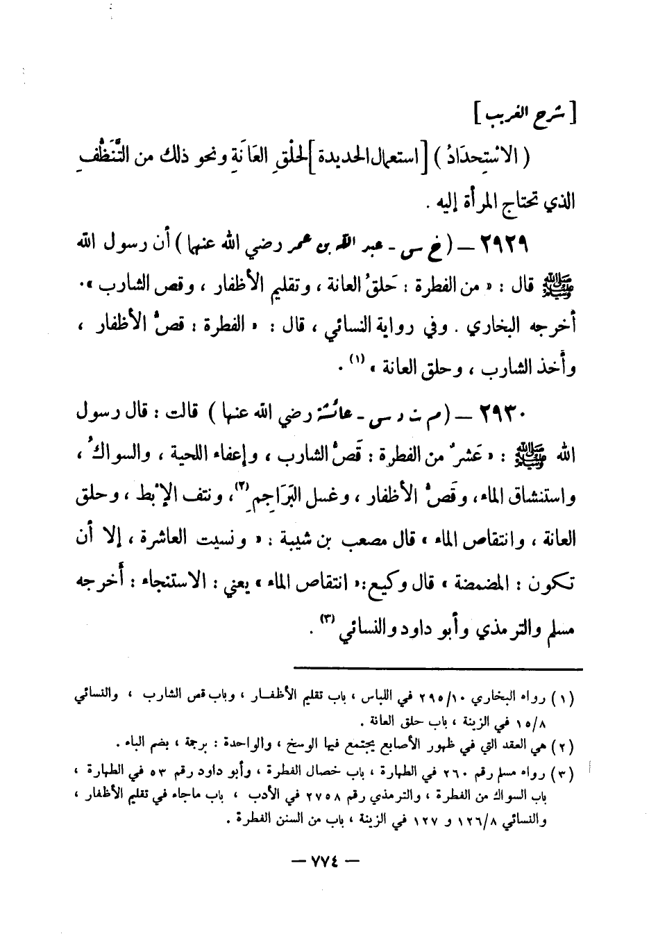 2929 - (خ س) عبد الله بن عمر - رضي الله عنهما -: أَنَّ رسولَ اللهِ - صلى الله عليه وسلم- قال: «من الفطرة: حَلقُ العانة، وتقليم الأظفار، وقص الشارب» . أخرجه البخاري. وفي رواية النسائي، قال: «الفطرة: قصُّ الأظفار، وأَخذ الشارب، وحلق العانة» (¬1) .