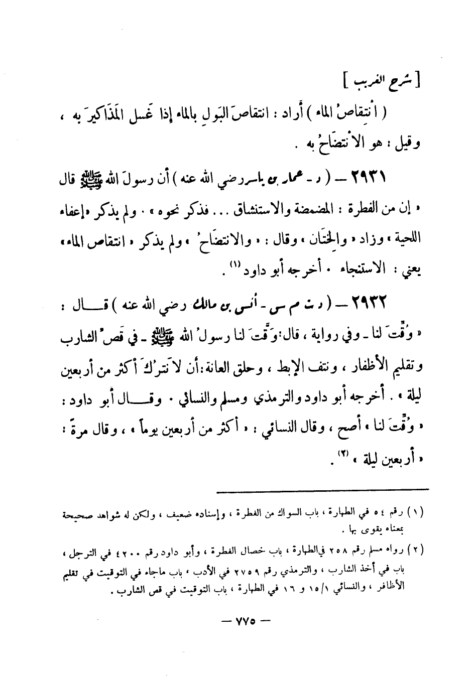 2932 - (د ت م س) أنس بن مالك - رضي الله عنه -: قال: «وُقِّتَ لنا - وفي رواية، قال: وَقَّتَ لنا رسولُ الله - صلى الله عليه وسلم- في قَصِّ الشارب، وتقليم الأظفار، ونتف الإِبط، وحلق العانة: أن لا نَترُكَ أكثر من أربعين ليلة» . أخرجه أبو داود، والترمذي، ومسلم، والنسائي.