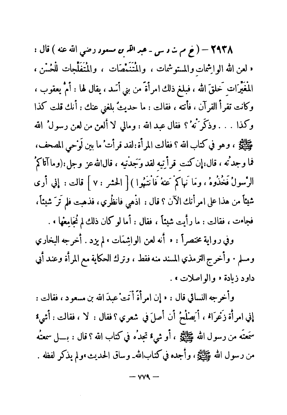 2938 - (خ م ت د س) عبد الله بن مسعود - رضي الله عنه -: قال: «لعن اللهُ الواشِماتِ والمستوشمات، والمُتنَمِّصَاتِ، والمُتَفَلِّجات لِلْحُسْن، المُغَيِّرَاتِ خَلقَ الله، فبلغ ذلك امرأة من بني أسَد، يقال لها: أمُّ يعقوب، وكانت تقرأ القرآن، فأتته، فقالت: ما حديثٌ بلغني عنك: أنك قلت: كذا وكذا ... وذكَرَتْهُ؟ فقال عبد الله: ومالي لا أَلعن من لعن رسولُ الله - صلى الله عليه وسلم-، وهو في كتاب الله؟ فقالت المرأة: لقد قرأتُ ما بين لَوْحي المصحف، فما وجدتُه، قال: إِن كنتٍ قرأتِيهِ لقد وَجَدْتيه، قال الله عز وجل: {وَما آتَاكُمُ الرَّسُولُ فَخُذُوهُ وَمَا نَهَاكُمْ عَنْهُ فَانْتَهُوا} [الحشر: 7] قالت: إِني أرى شيئاً من هذا على امرأتك الآن؟ قال: اذْهبي فانظُري، فذهبت فلم تَرَ شيئاً، فجاءت، فقالت: ما رأَيت شيئاً، فقال: أما لو كان ذلك لم نُجَامِعْها» .