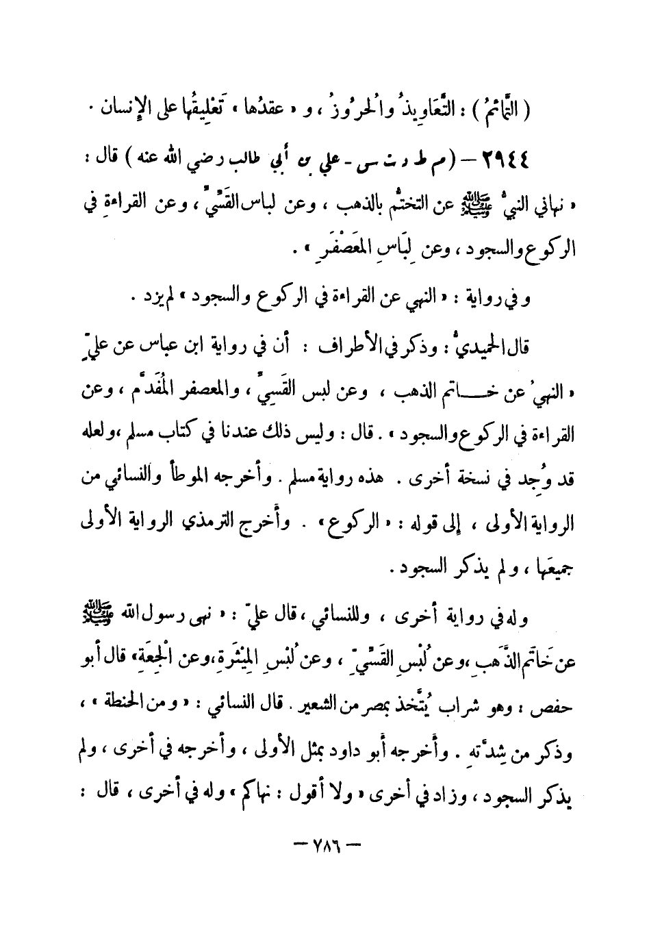 (¬1) رواه مسلم رقم (2078) في اللباس باب النهي عن لبس الرجل الثوب المعصفر، والموطأ 1 / 80 في الصلاة، باب العمل في القراءة، وأبو داود رقم (4044) و (4045) و (4046) و (4050) في اللباس، باب من كره لبس الحرير، ورقم (4225) في الخاتم، باب خاتم الحديد، والترمذي رقم (264) في الصلاة، باب ما جاء في النهي عن القراءة في الركوع والسجود، والنسائي 2 / 187 و 188 في الصلاة، باب النهي عن القراءة في الركوع، وفي الزينة، باب خاتم الذهب، وباب الاختلاف على يحيى بن أبي كثير فيه، وباب حديث عبيدة، وباب النهي عن لبس خاتم الذهب، وباب النهي عن لبس المعصفر، وباب النهي عن الجلوس على المياثر من الأرجوان.