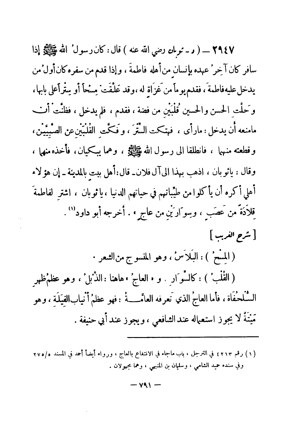 2947 - (د) ثوبان - رضي الله عنه -: قال: كان رسولُ الله - صلى الله عليه وسلم- إِذا سافر كان آخِرُ عهده بإنسانٍ من أهله فاطمةَ، وإذا قدم من سفره كان أولُ من يدخل عليه فاطمةَ، فقدم يوماً من غَزَاةٍ له، وقد عَلَّقَتْ مِسْحاً أو سِتْراً على بابها، وحَلَّتِ الحسن والحسين قُلْبَيْنِ من فضة، فقدم، فلم يدخل، فظنَّتْ أن ما منعه أَن يدخل: ما رأى، فهتكت السِّتْرَ، وَفَكَّتِ القُلْبَيْنِ عن الصَّبِيَّيْن، وقطعته منهما، فانطلقا إلى رسول الله - صلى الله عليه وسلم-، وهما يبكيان، فأخذه منهما، وقال: «يا ثوبان، اذهب بهذا إلى آل فلان، قال: أهل بيتٍ بالمدينة - إِن هؤلاء أهلي أكره أن يأكلوا من طيِّباتهم في حياتهم الدنيا، يا ثوبان، اشترِ لفاطمةَ قِلادَة من عَصَبٍ، وسِوَارَيْنِ من عَاجٍ» . أَخرجه أبو داود (¬1) .