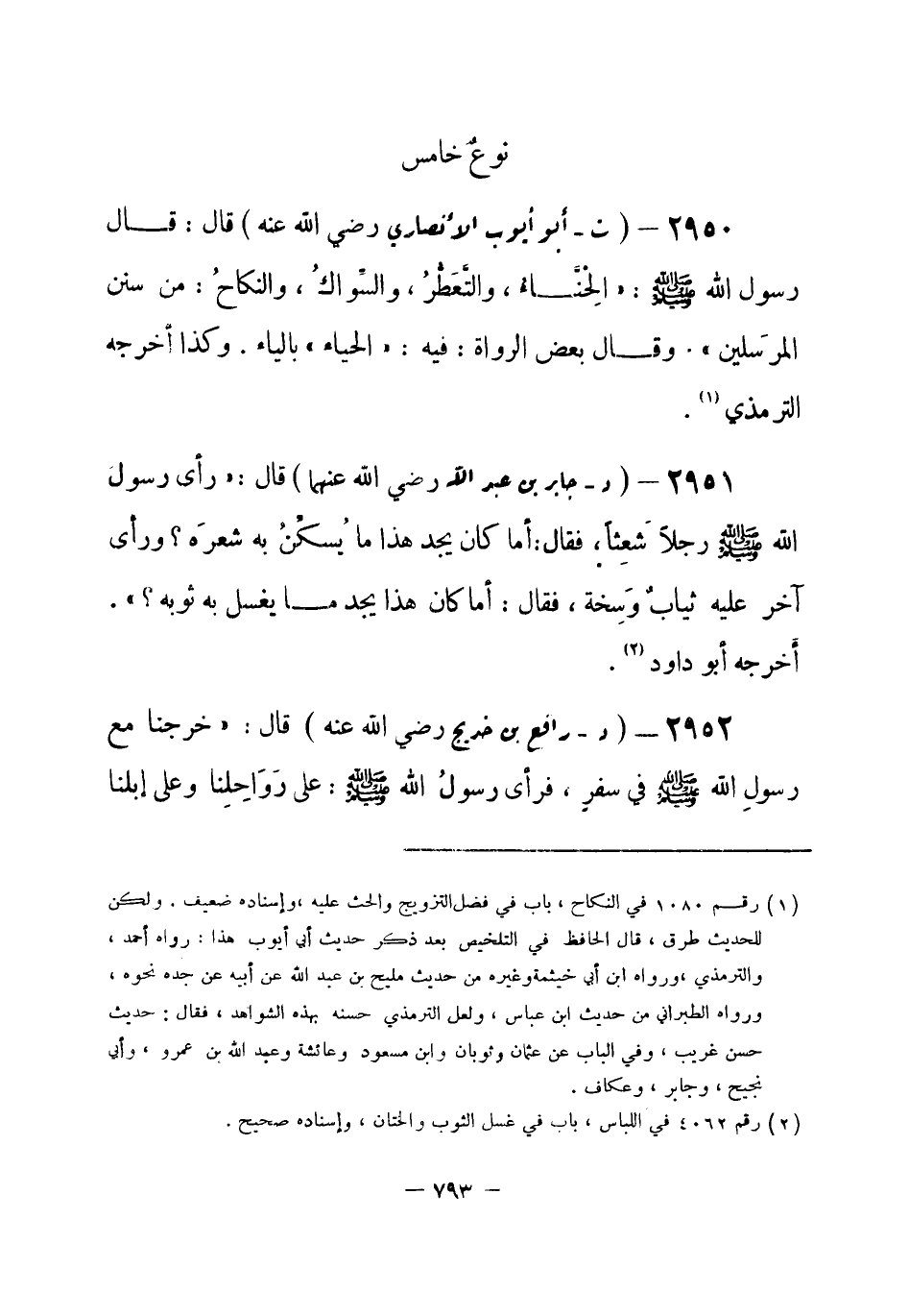 2950 - (ت) أبو أيوب الأنصاري - رضي الله عنه -: قال: قال رسول الله - صلى الله عليه وسلم-: «الحِنَّاءُ، والتَّعَطُّرُ، والسِّواكُ، والنكاحُ: من سنن المرسَلين» . وقال بعض الرواة: فيه: «الحياء» بالياء. وكذا أَخرجه الترمذي (¬1) .