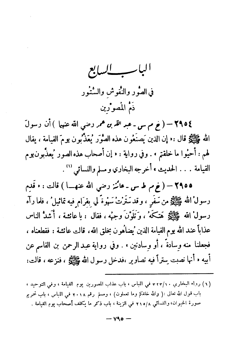 2955 - (خ م ط س) عائشة - رضي الله عنها -: قالت: «قَدِمَ رسولُ الله - صلى الله عليه وسلم- من سَفَرٍ، وقد سَتَرْتُ سَهْوة لي بِقِرَامٍ فيه تماثيلُ، فلما رآه رسولُ الله -صلى الله عليه وسلم- هَتكَهُ، وتَلَوَّنَ وجهُه، فقال: يا عائشة، أَشَدُّ الناس عذاباً عند الله يوم القيامة الذين يُضاهُونَ بخلق الله، قالت عائشة: فقطعناه، فجعلنا منه وِسادة، أَو وِسادتين» . وفي رواية عبد الرحمن بن القاسم عن أبيه: «أنها نصبت سِتراً فيه تصاوير، فدخل رسول الله - صلى الله عليه وسلم-، فنزعه، قالت: -[796]- فَقَطَعْتُهُ وسادتين، فقال رجل في المجلس حينئذ - يقال له: ربيعة بن عطاء - مولى بني زهرة: أَفما سمعتَ أبا محمد، يعني: أباه - يذكر أن عائشة قالت: فكان رسول الله - صلى الله عليه وسلم- يَرتَفِقُ عليها؟ فقال ابن القاسم: لا، فقال: لكني قد سمعته» . يريد: القاسم بن محمد.