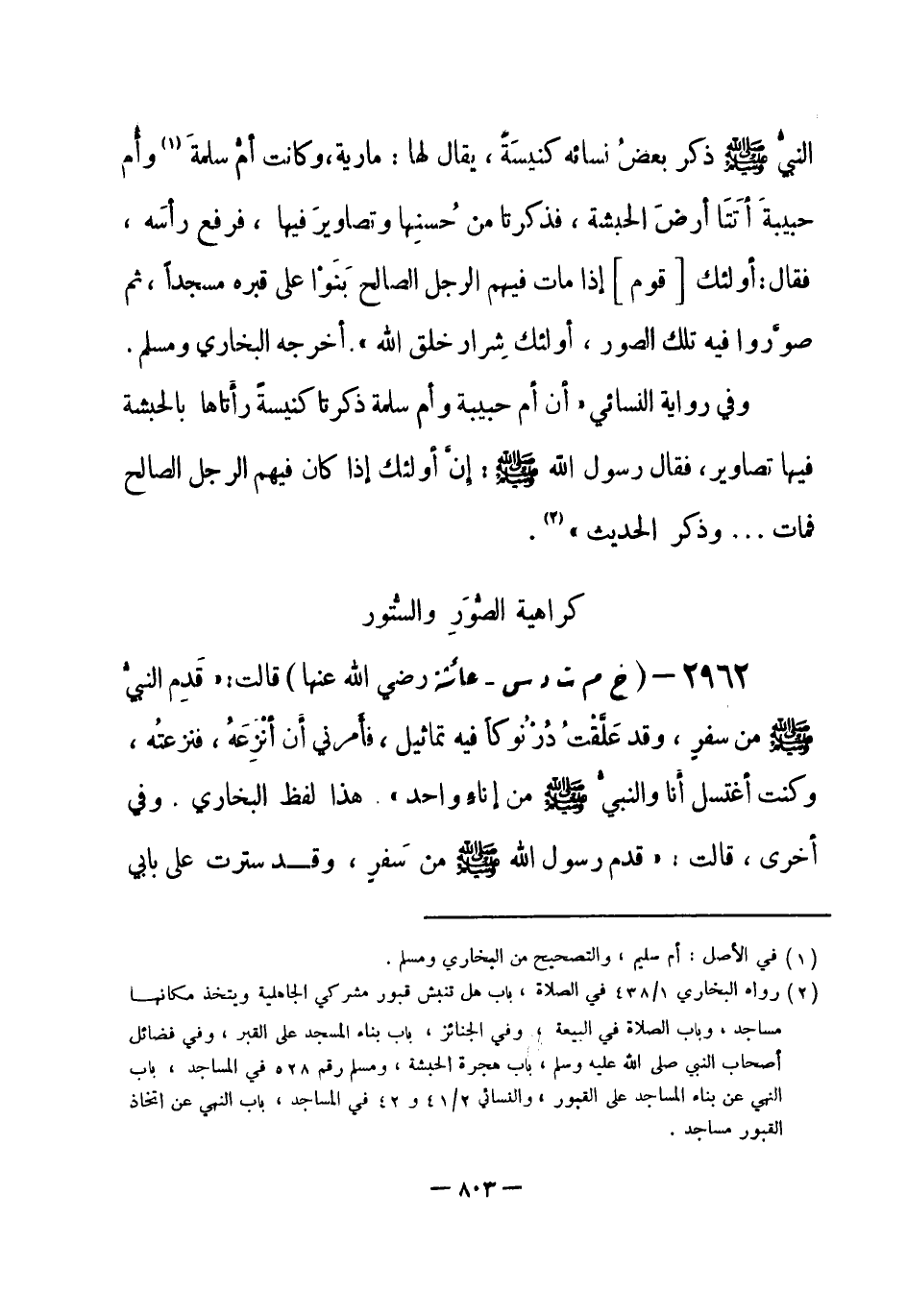 (¬1) رواه البخاري 10 / 325 و 326 في اللباس، باب ما وطئ من التصاوير، وفي المظالم، باب هل تكسر الدنان التي فيها الخمر، وفي الأدب، باب ما يجوز من الغضب والشدة لأمر الله، ومسلم رقم (2107) في اللباس، باب تحريم تصوير صورة الحيوان، والترمذي رقم (2470) في صفة يوم القيامة، باب رقم (33) ، وأبو داود رقم (4153) في اللباس، باب في الصور، والنسائي 8 / 213 في الزينة، باب التصاوير.