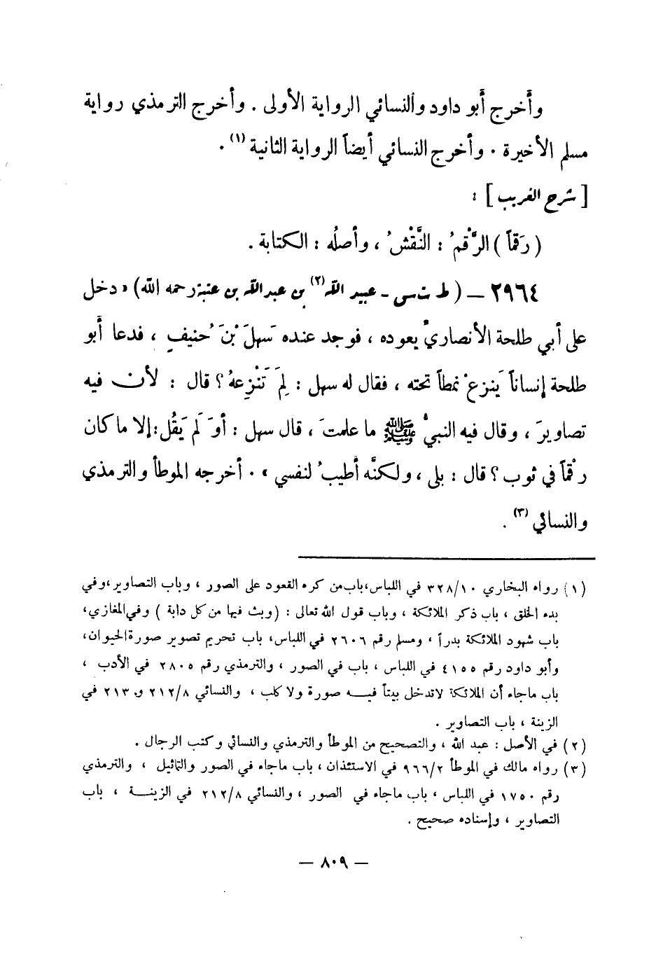 2964 - (ط ت س) عبيد الله (¬1) بن عبد الله بن عتبة - رحمه الله -: «دخل على أبي طلحة الأنصاريِّ يعوده، فوجد عنده سَهلَ بْنَ حُنيفٍ، فدعا أَبو طلحة إِنساناً يَنزعْ نمطاً تحته، فقال له سهل: لِمَ تَنْزِعهُ؟ قال: لأن فيه تصاويرَ، وقال فيه النبيُّ - صلى الله عليه وسلم- ما علمتَ، قال سهل: أَوَ لَم يَقُل: إِلا ما كان رقماً في ثوب؟ قال: بلى، ولكنَّه أَطيبُ لنفسي» . أخرجه الموطأ، والترمذي، والنسائي (¬2) .