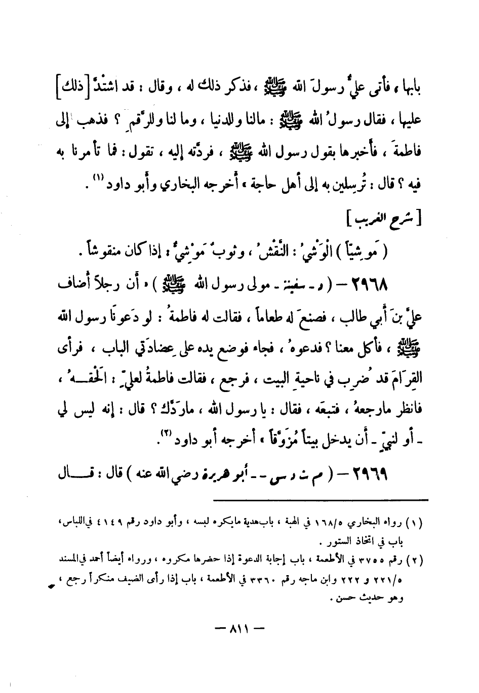 2968 - (د) سفينة - مولى رسول الله - صلى الله عليه وسلم-: «أن رجلاً أَضاف عليَّ بنَ أبي طالب، فصنعَ له طعاماً، فقالت له فاطمةُ: لو دَعونَا رسول الله - صلى الله عليه وسلم-، فأكل معنا؟ فدعوهُ، فجاء فوضع يده على عِضادَتي الباب، فرأى القِرَامَ قد ضُرِب في ناحيةِ البيت، فرجع، فقالت: فاطمةُ لعليٍّ: الحَقهُ، فانظر ما رَجعهُ، فتبعَه، فقال: يا رسول الله، ما رَدَّك؟ قال: إِنه ليس لي - أو لنبيٍّ - أَن يدخل بيتاً مُزَوَّقاً» . أَخرجه أبو داود (¬1) .