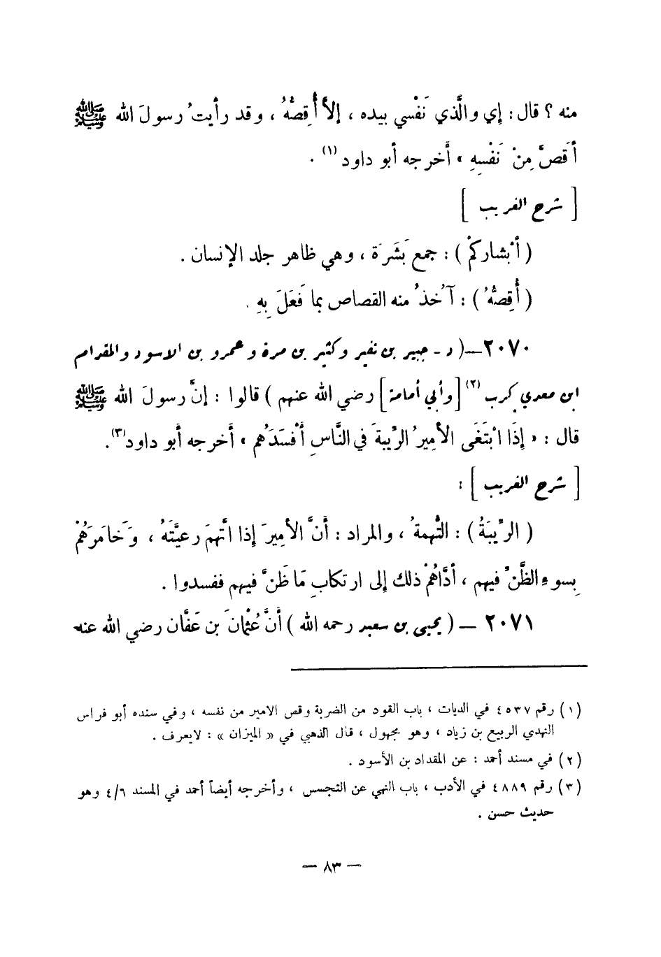 2070 - (د) جبير بن نفير، وكثير بن مرة، وعمرو بن الأسود، والمقدام بن معدي كرب (¬1) ، [وأبي أمامة]- رضي الله عنهم -: قالوا: إنَّ رسولَ الله - صلى الله عليه وسلم- قال: «إذَا ابْتَغَى الأمِيرُ الرِّيبةَ في النَّاسِ أَفْسَدَهُم» . أخرجه أبو داود (¬2) .