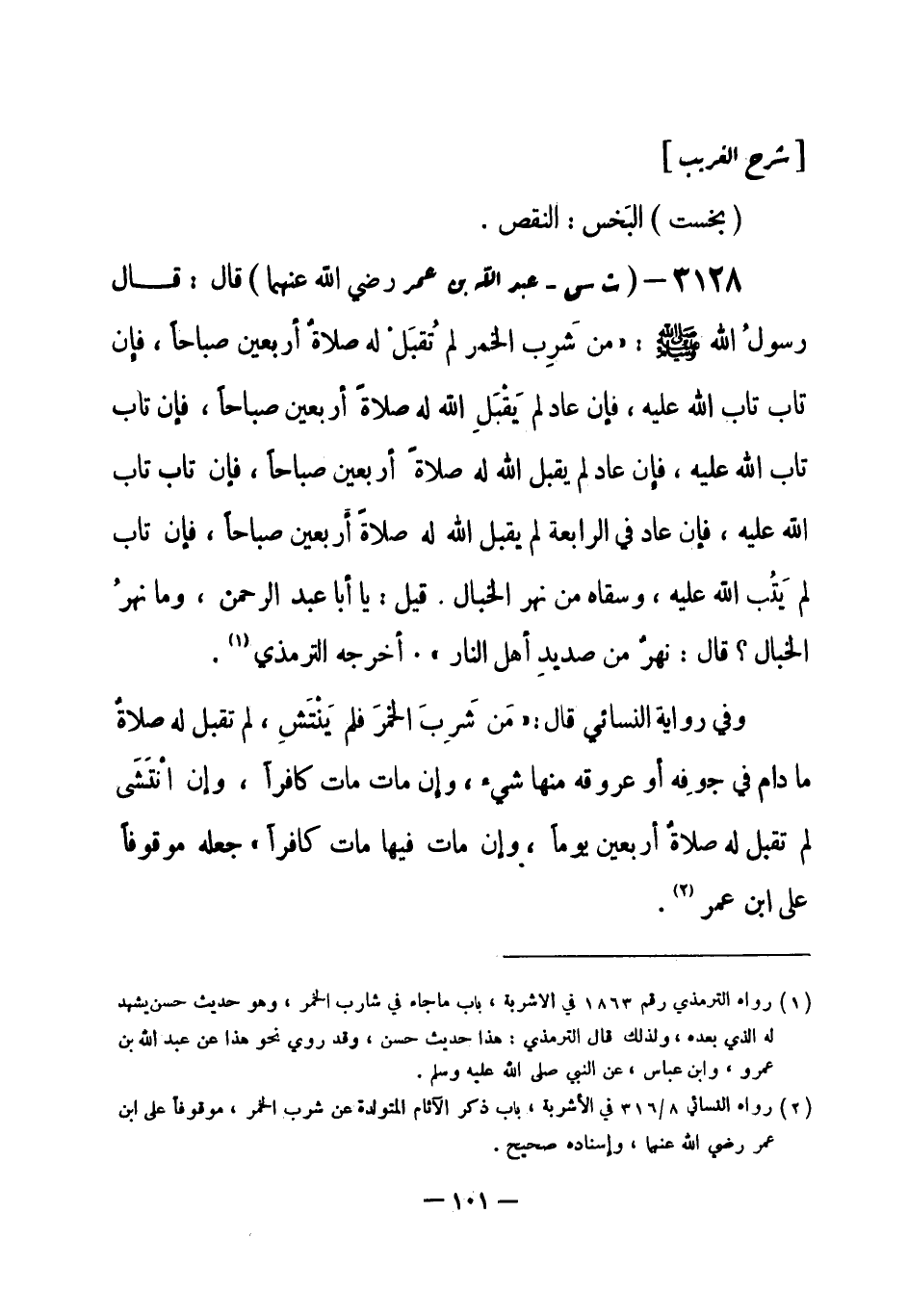 3128 - (ت س) عبد الله بن عمر - رضي الله عنهما -: قال: قال رسولُ - صلى الله عليه وسلم-: «من شَرِب الخمر لم تُقبَلْ له صلاة أربعين صباحاً، فإن تاب تاب الله عليه، فإن عاد لم يَقبَلِ الله له صلاة أربعين صباحاً، فإن تاب تاب الله عليه، فإن عاد لم يقبل الله له صلاة أربعين صباحاً، فإن تاب تاب الله عليه، فإن عاد في الرابعة لم يقبل الله له صلاة أربعين صباحاً، فإن تاب لم يَتُب الله عليه، وسقاه من نهر الخبال. قيل: يا أبا عبد الرحمن، وما نهرُ الخبال؟ قال: نهر من صديد أهل النار» أخرجه الترمذي (¬1) .