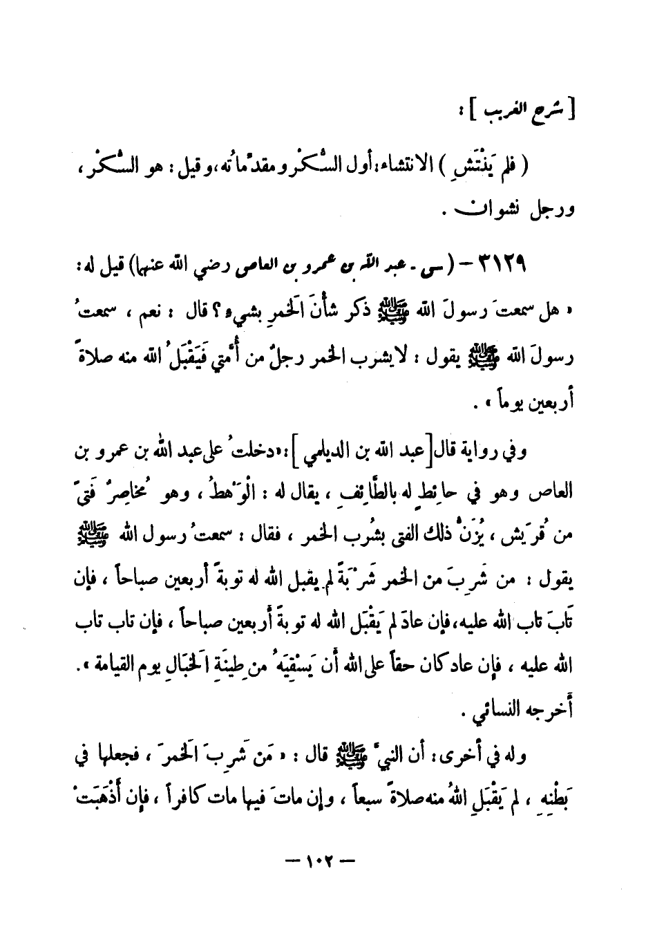 3129 - (س) عبد الله بن عمرو بن العاص - رضي الله عنهما -: قيل له: هل سمعتَ رسولَ -صلى الله عليه وسلم- ذكر شأنَ الخَمرِ بشيء؟ قال: نعم، سمعتُ رسولَ الله -صلى الله عليه وسلم- يقول: «لا يشرب الخمر رجل من أُمَّتي فيَقْبلُ الله منه صلاة أربعين يوماً» .