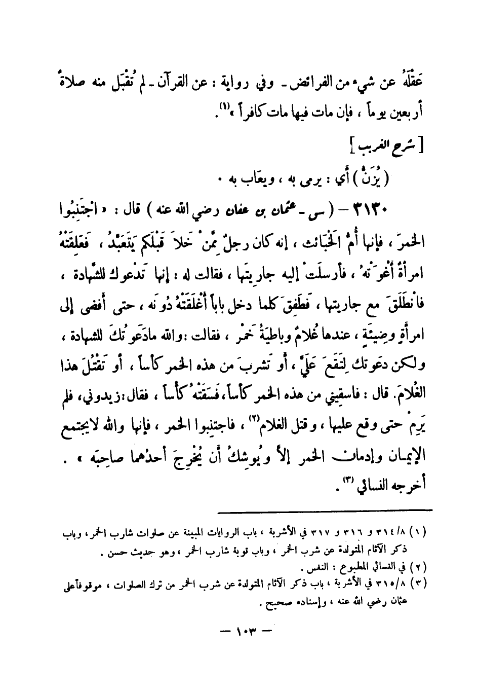 3130 - (س) عثمان بن عفان - رضي الله عنه - قال: «اجْتَنِبُوا الخمرَ، فإنها أم الخبَائث، إنه كان رجل مِمَّن خلا قَبْلَكم يَتَعَبَّدُ، فَعَلِقَتْهُ امرأة أَغوَتْهُ، فأرسَلَتْ إليه جاريتها، فقالت له: إنها تَدْعوك للشهادة، فانْطَلَقَ مع جاريتها، فَطَفِقَ كلما دخلَ باباً أَغْلَقَتْهُ دُونَهُ، حَتى أَفضى إلى امرأة وضِيئَة عندها غُلام وباطيَةُ خمْر، فقالت: والله ما دَعَوتُك للشهادة، ولكن دعوتكَ لِتَقَعَ عليَّ أَو تَشرَبَ من هذه الخمر كأساً، أو تَقْتُلَ هذا الغُلامَ. قال: فاسقِيني من هذه الخمر كأساً، فسَقتهُ كأساً فقال: زيدوني، فلم يَرِمْ حتى وقع عليها، وقتل الغلام (¬1) ، فاجتنبو الخمر فإنها والله لا يجتمع الإيمان وإدمان الخمر إلا ويُوشكُ أن يُخْرِجَ أحدُهما صاحبه» . أخرجه النسائي (¬2) . -[104]-