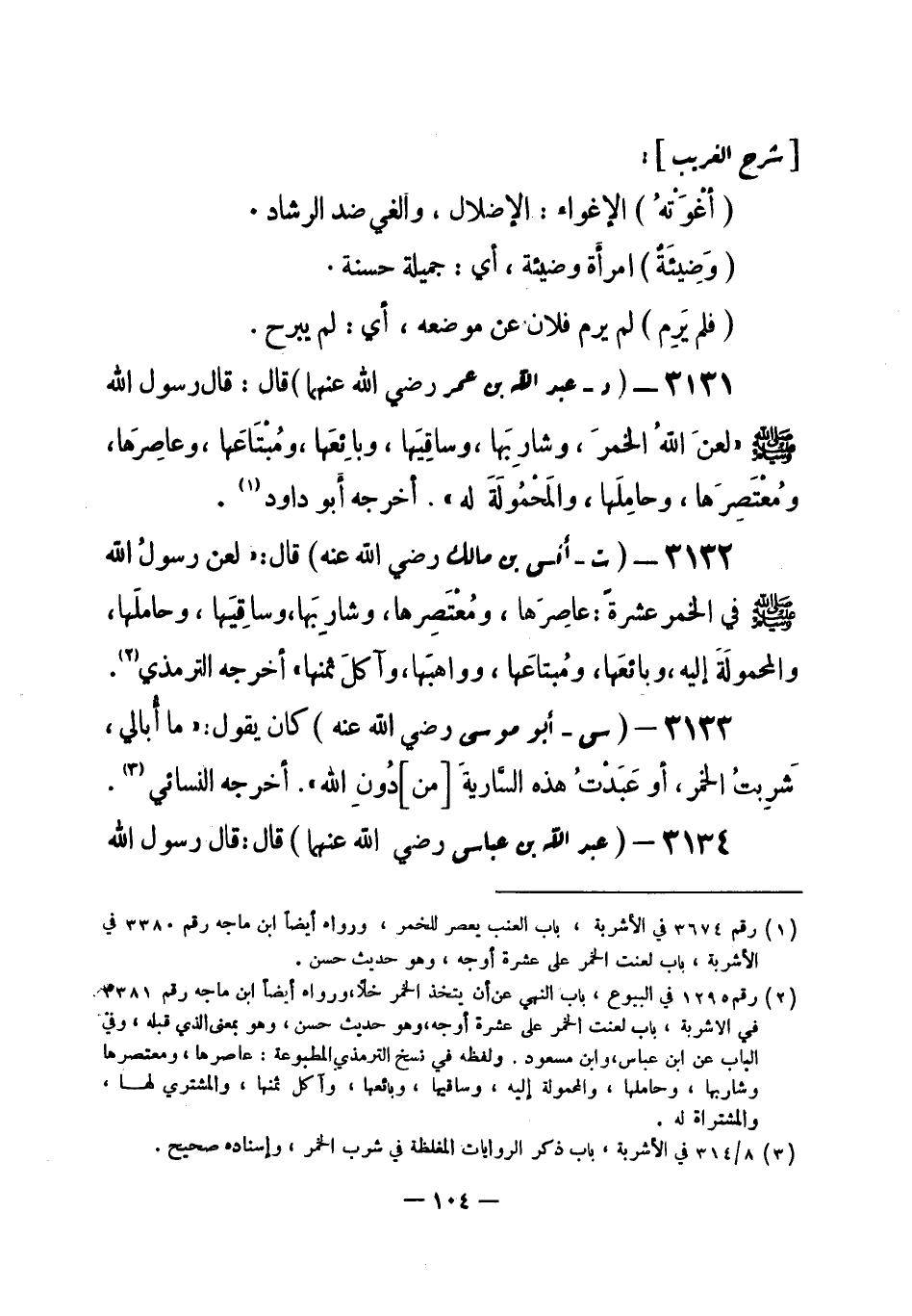 3131 - (د) عبد الله بن عمر - رضي الله عنهما -: قال: قال رسول الله -صلى الله عليه وسلم- «لعن الله الخمرَ، وشاربَها، وساقيهَا، وبائعهَا، ومُبْتَاعها، وعاصِرَها، ومُعتَصِرهَا، وحامِلَها، والمحْمُولَةَ له» . أخرجه أبو داود (¬1) .