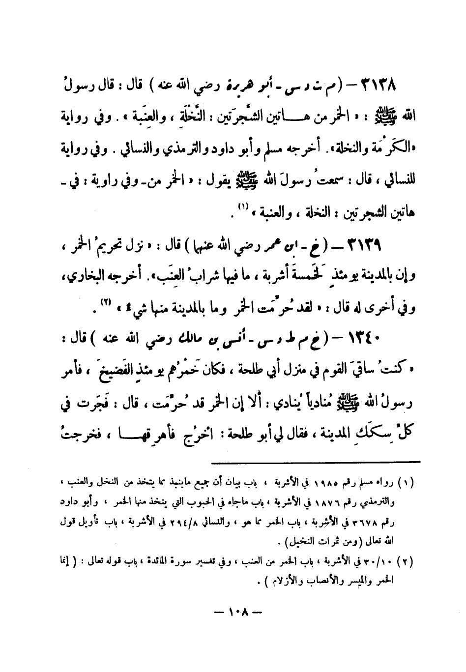 3138 - (م ت د س) أبو هريرة - رضي الله عنه - قال: قال رسولُ الله - صلى الله عليه وسلم-: «الخمر من هاتين الشَّجرتين: النخلَةِ، والعِنبة» . وفي رواية «الكَرْمة والنخلة» . أخرجه مسلم وأبو داود والترمذي والنسائي.