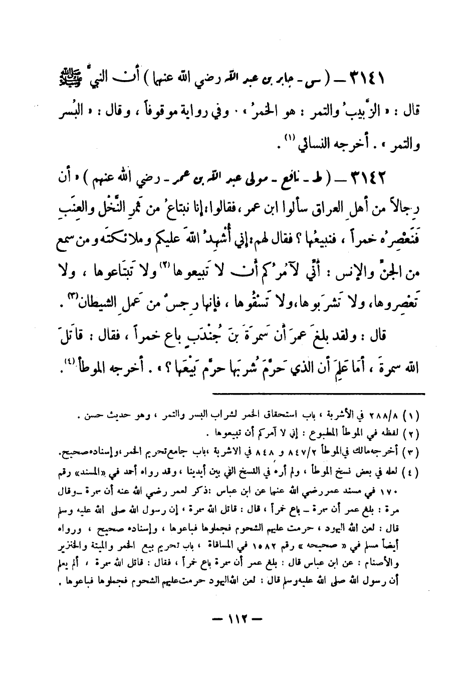 3142 - (ط) نافع - مولى عبد الله بن عمر - رضي الله عنهم - «أن رجالاً من أهلِ العراق سألوا ابن عمر، فقالوا: إنا نبتاعُ من ثمرِ النّخْلِ والعِنَبِ فَنَعْصِرُه خمراً، فنبيعُها؟ فقال لهم: إني أُشْهِدُ الله عليكم وملائكته ومن سمع من الجنِّ والإنس: أنِّي لآمركم أن لا تبيعوها (¬1) ، ولا تَبتَاعوها، ولا تعْصِروها، ولا تشرَبوها، ولا تَسْقُوها، فإنها رجس من عَملِ الشيطان (¬2) .