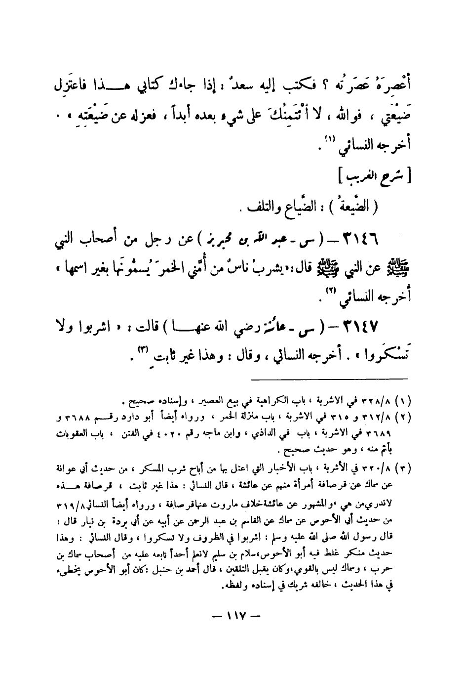 3147 - (س) عائشة - رضي الله عنها -: قالت: «اشربوا ولا تَسكَروا» . أخرجه النسائي، وقال، وهذا غير ثابت (¬1) .