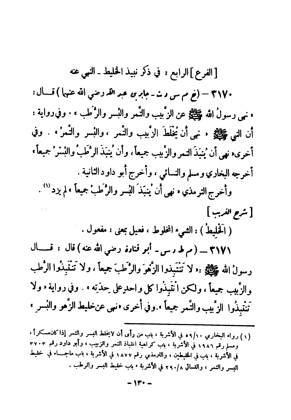 3171 - (خ م ط د س) أبو قتادة - رضي الله عنه - قال: قال رسولُ الله -صلى الله عليه وسلم-: «لا تنْتَبِذُوا الزَّهوَ والرُّطبَ جميعاً، ولا تنْتَبِذُوا الرُّطب والزَّبيب جميعاً، ولكن انتَبِذُوا كل واحد على حِدَتِهِ» .