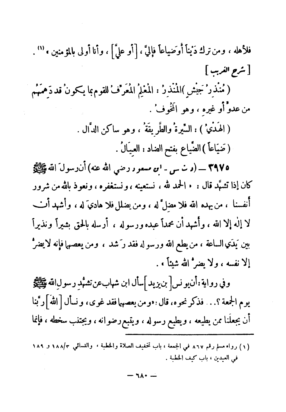 3975 - (د ت س) ابن مسعود - رضي الله عنه -: أن رسولَ الله - صلى الله عليه وسلم- كان إذا تشهَّد قال: «الحمد لله، نستعينه، ونستغفره، ونعوذ بالله من شرور أنفسنا، من يهده الله فلا مضِلَّ له، ومن يضلل فلا هاديَ له، وأشهد أن لا إله إلا الله، وأشهد أن محمداً عبده ورسولهُ، أرسله بالحق بشيراً ونذيراً بين يَدَي الساعة، من يطع الله ورسوله فقد رَشد، ومن يعصهما فإنه لا يضرُّ إلا نفسه، ولا يضرُّ الله شيئاً» .