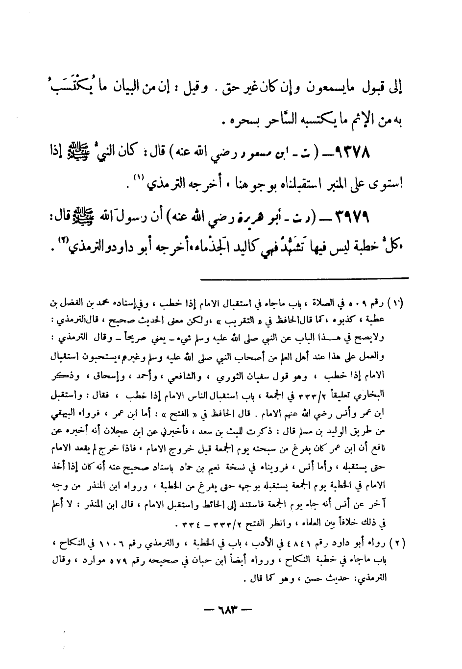 3978 - (ت) ابن مسعود - رضي الله عنه -: قال: «كان النبيُّ - صلى الله عليه وسلم- إذا استوى على المنبر استقبلناه بوجوهنا» . أخرجه الترمذي (¬1) .