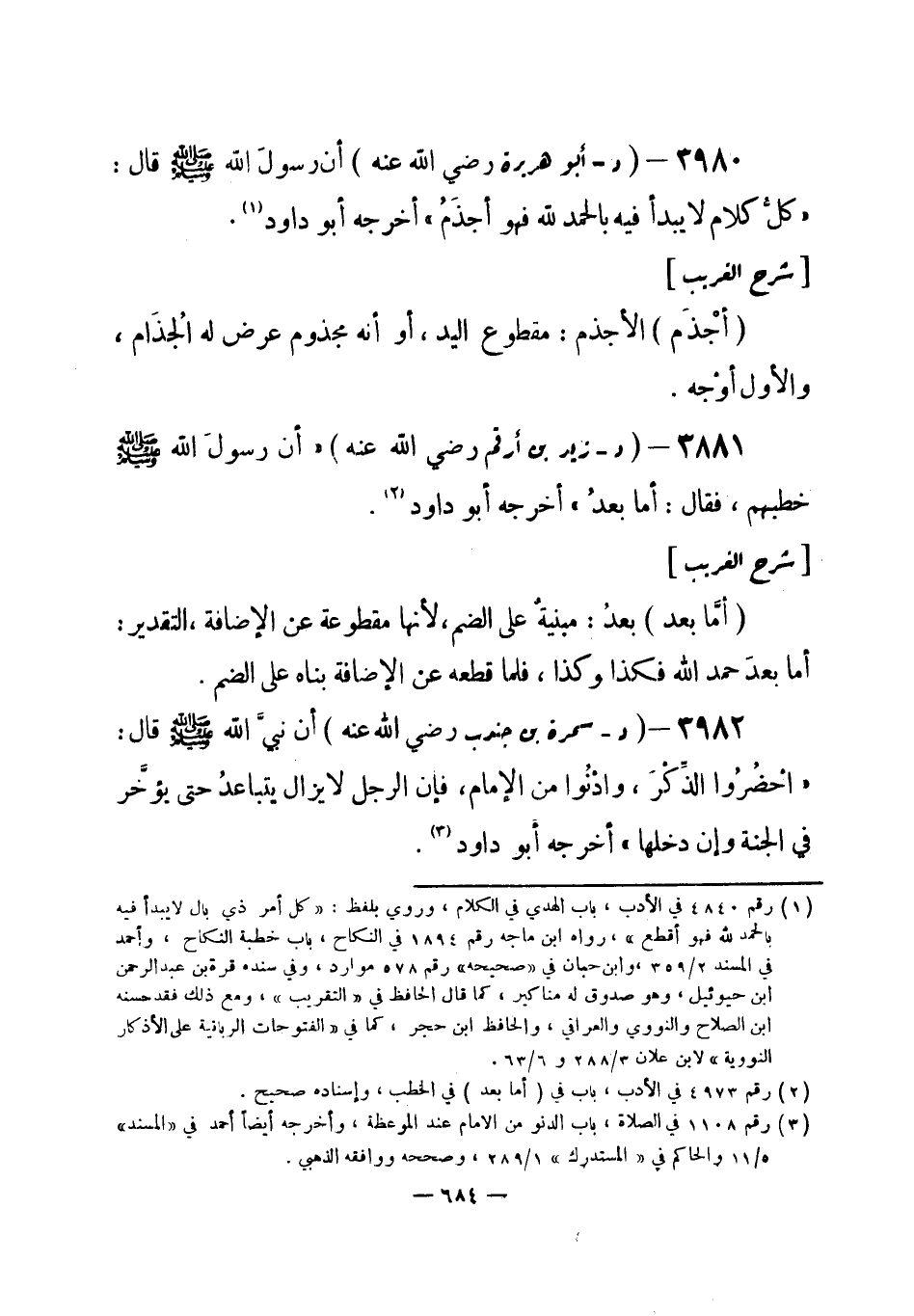 3980 - (د) أبو هريرة - رضي الله عنه - أن رسولَ الله - صلى الله عليه وسلم- قال: «كلُّ كلام لا يبدأ بالحمد لله فهو أجذمُ» أخرجه أبو داود (¬1) .