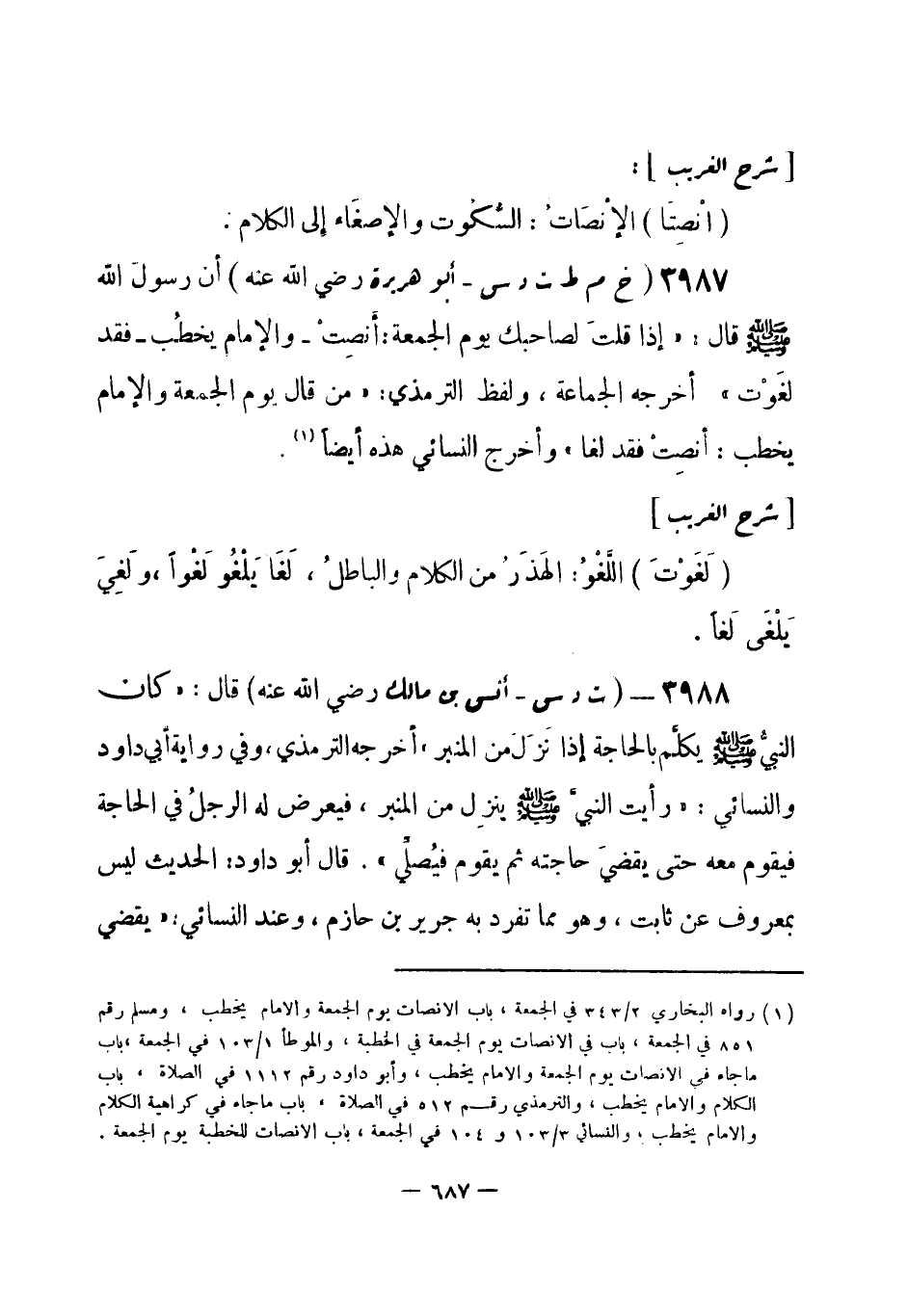 3987 - (خ م ط ت د س) أبو هريرة - رضي الله عنه -: أن رسولَ الله - صلى الله عليه وسلم- قال: «إذا قلتَ لصاحبك يوم الجمعة: أنصِتْ - والإمام يخطُب - فقد لَغوْت» . أخرجه الجماعة، ولفظ الترمذي: «من قال يوم الجمعة والإمام يخطب: أنصِتْ قد لغا» وأخرج النسائي هذه أيضاً (¬1) .
