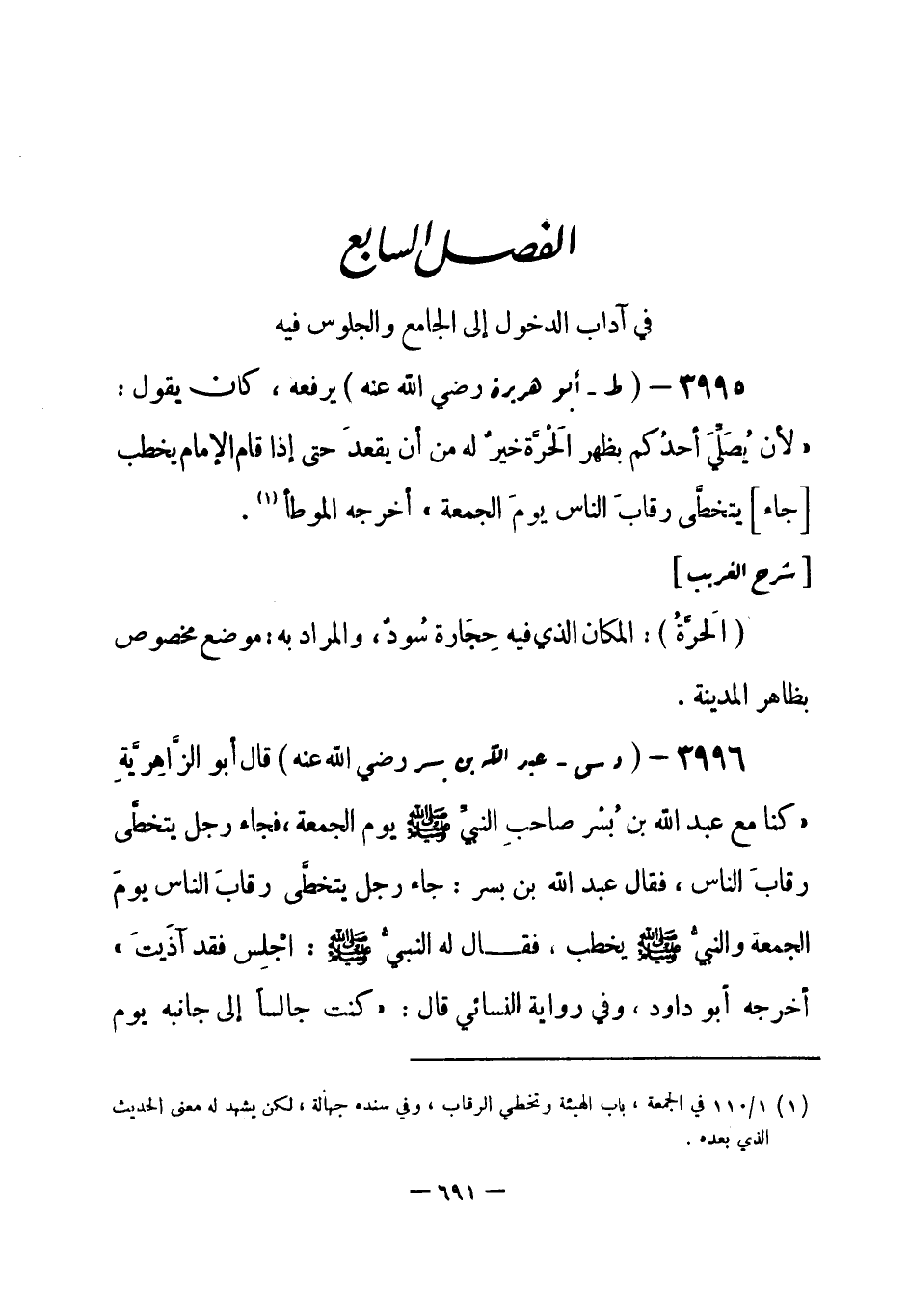 (¬1) رواه أبو داود رقم (1118) في الصلاة، باب تخطي رقاب الناس يوم الجمعة، والنسائي 3 / 103 في الجمعة، باب النهي عن تخطي رقاب الناس والإمام يخطب على المنبر يوم الجمعة، وإسناده حسن، ورواه أيضاً ابن حبان في " صحيحه " رقم (572) موارد.