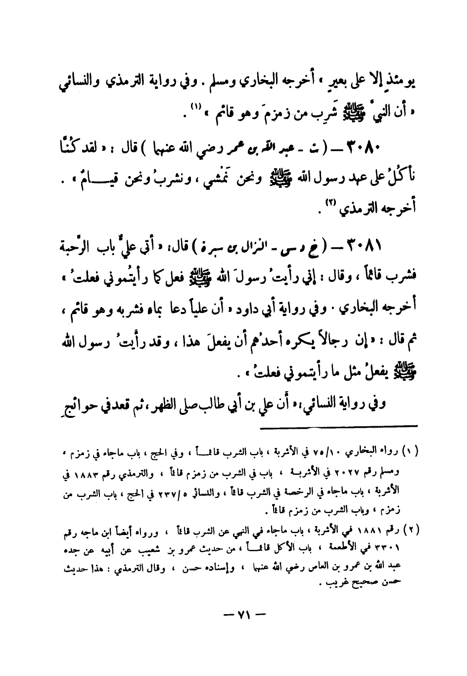 (¬1) رواه البخاري 10 / 71 في الأشربة، باب الشرب قائماً، وأبو داود رقم (3718) في الأشربة، باب في الشرب قائماً، والنسائي 1 / 84 و 85 في الطهارة، باب صفة الوضوء من غير حدث.