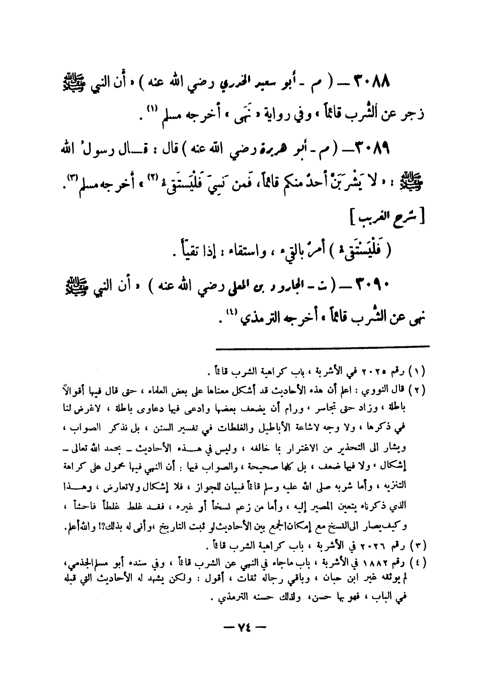 3088 - (م) أبو سعيد الخدري - رضي الله عنه - «أن النبي - صلى الله عليه وسلم- زجر عن الشُّرب قائماً» وفي رواية «نَهَى» أخرجه مسلم (¬1) .