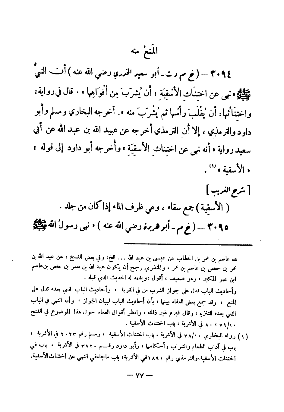 3094 - (خ م د ت) أبو سعيد الخدري - رضي الله عنه - أن النبيَّ - صلى الله عليه وسلم-: «نهى عن اختِناثِ الأسْقِيةِ: أن يُشرَبَ مِن أَفوَاهِهَا» .