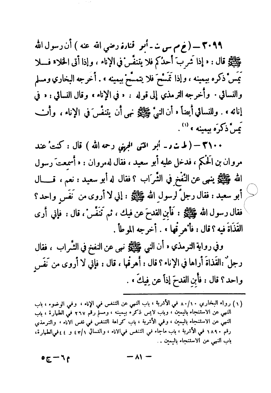 (¬1) رواه البخاري 10 / 80 في الأشربة، باب النهي عن التنفس في الاناء، وفي الوضوء، باب النهي عن الاستنجاء باليمين، وباب لا يمس ذكره بيمينه، ومسلم رقم (267) في الطهارة، باب النهي عن الاستنجاء باليمين، وفي الأشربة، باب كراهة التنفس في نفس الاناء، والترمذي رقم (1890) في الأشربة، باب ما جاء في التنفس في الاناء، والنسائي 1 / 43 و 44 في الطهارة، باب النهي عن الاستنجاء باليمين.