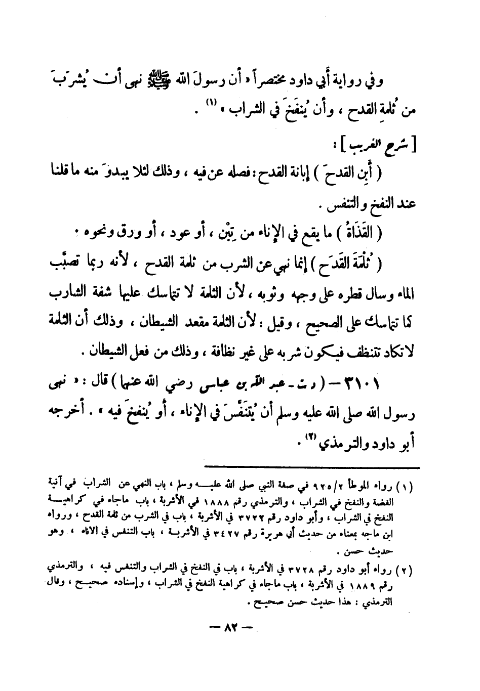 (¬1) رواه أبو داود رقم (3728) في الأشربة، باب في النفخ في الشراب والتنفس فيه، والترمذي رقم (1889) في الأشربة، باب ما جاء في كراهية النفخ في الشراب، وإسناده صحيح، وقال الترمذي: هذا حديث حسن صحيح.