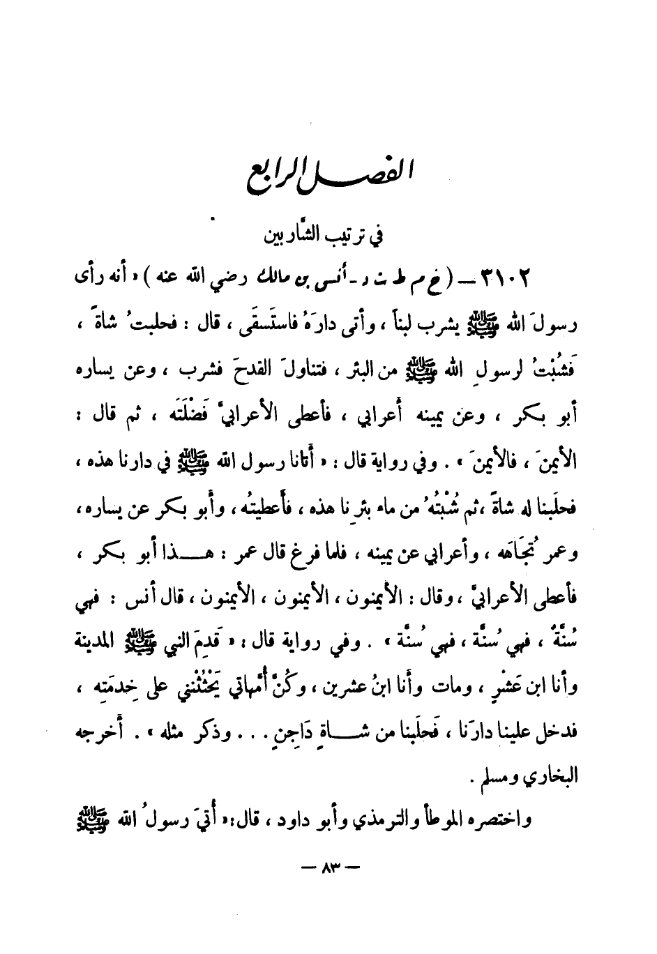 واختصره الموطأ والترمذي وأبو داود، قال: «أتيَ رسولُ الله - صلى الله عليه وسلم -[84]- بِلَبَن قد شِيبَ بماءِ، وعن يمينه أَعرابي، وعن يساره أبو بكر الصِّدِّيق، فشرب، ثم أعطى الأعرابي، وقال الأيمنَ فالأيمنَ» (¬1) .