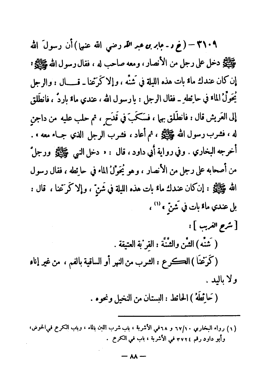 3109 - (خ د) جابر بن عبد الله - رضي الله عنهما -: «أن رسول الله - صلى الله عليه وسلم- دخل على رجل من الأنصار، ومعه صاحب له، فقال رسول الله - صلى الله عليه وسلم- إن كان عندك ماء بات هذه الليلة في شنِّه، وإلا كَرَعْنا - قال: والرجل يُحوِّل الماءَ في حائطهِ - فقال الرجل: يا رسول الله، عندي ماء بارد، فانطَلق إلى العَريش قال: فانطَلق بهما، فَسَكَب في قدَح، ثم حلب عليه من داجن له، فشرب رسول الله - صلى الله عليه وسلم-، ثم أعاد، فشرب الرجل الذي معه» . أخرجه البخاري.